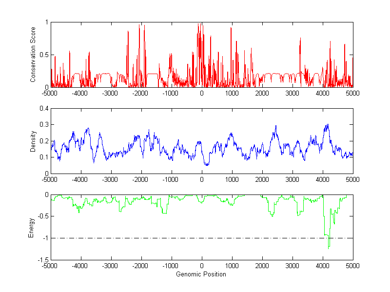 The energy profile (green curve) is about energy for module detection based on TF interaction. The positions with energy less than -1 indicate the existence of CRMs.