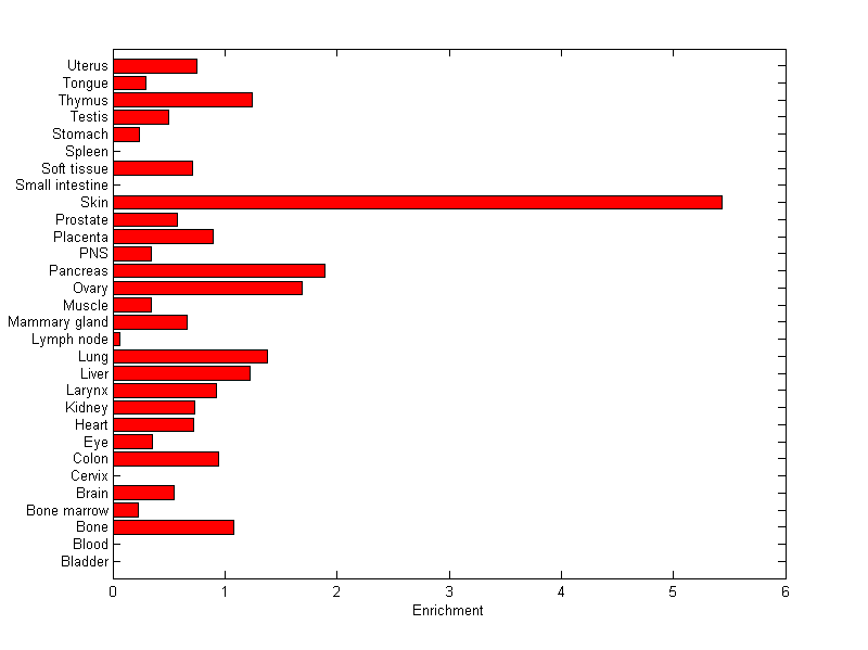 The expression level is normalized with tissue-library size. Each value for a gene in a tissue is a ratio of observed ESTs to the expected one in this tissue. The expected number of ESTs is the product of total ESTs of the gene and the fraction of total ESTs in the tissue among all ESTs in 30 tissues.