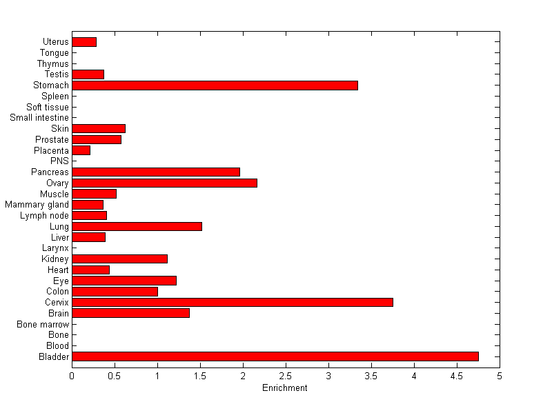 The expression level is normalized with tissue-library size. Each value for a gene in a tissue is a ratio of observed ESTs to the expected one in this tissue. The expected number of ESTs is the product of total ESTs of the gene and the fraction of total ESTs in the tissue among all ESTs in 30 tissues.