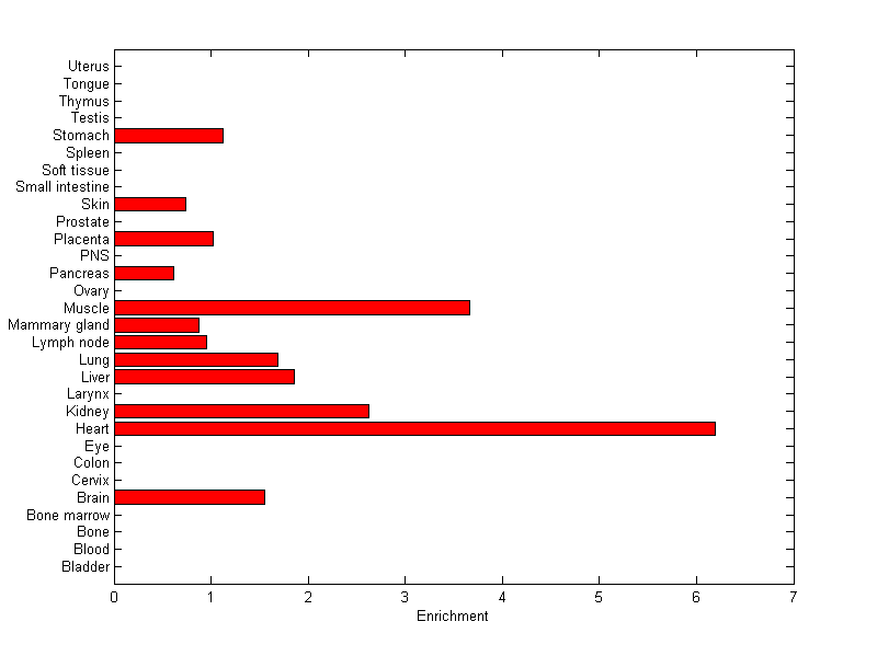 The expression level is normalized with tissue-library size. Each value for a gene in a tissue is a ratio of observed ESTs to the expected one in this tissue. The expected number of ESTs is the product of total ESTs of the gene and the fraction of total ESTs in the tissue among all ESTs in 30 tissues.