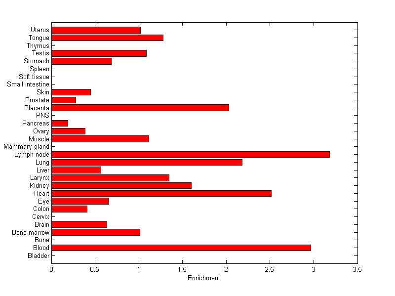 The expression level is normalized with tissue-library size. Each value for a gene in a tissue is a ratio of observed ESTs to the expected one in this tissue. The expected number of ESTs is the product of total ESTs of the gene and the fraction of total ESTs in the tissue among all ESTs in 30 tissues.