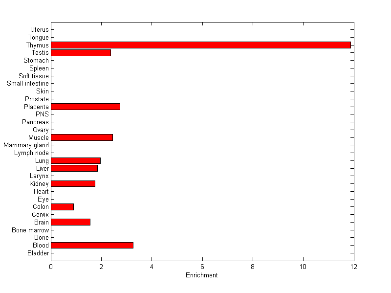 The expression level is normalized with tissue-library size. Each value for a gene in a tissue is a ratio of observed ESTs to the expected one in this tissue. The expected number of ESTs is the product of total ESTs of the gene and the fraction of total ESTs in the tissue among all ESTs in 30 tissues.