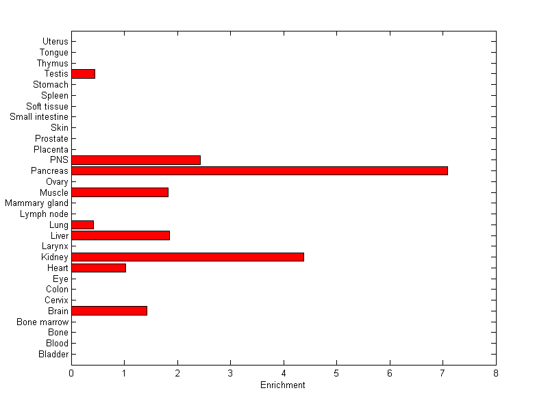 The expression level is normalized with tissue-library size. Each value for a gene in a tissue is a ratio of observed ESTs to the expected one in this tissue. The expected number of ESTs is the product of total ESTs of the gene and the fraction of total ESTs in the tissue among all ESTs in 30 tissues.