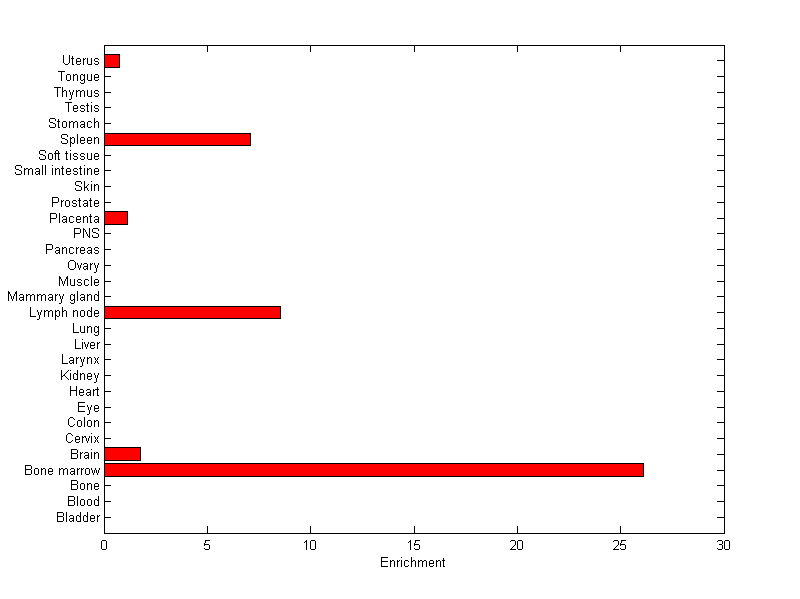 The expression level is normalized with tissue-library size. Each value for a gene in a tissue is a ratio of observed ESTs to the expected one in this tissue. The expected number of ESTs is the product of total ESTs of the gene and the fraction of total ESTs in the tissue among all ESTs in 30 tissues.