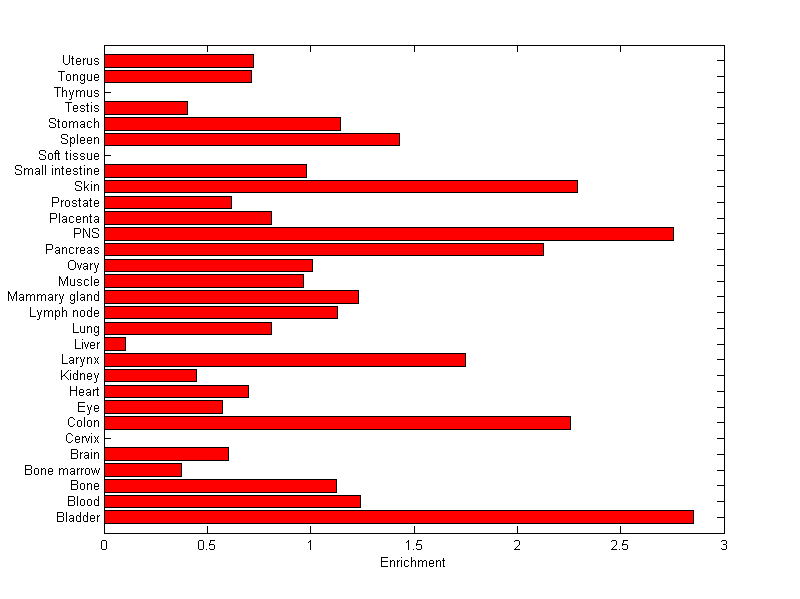 The expression level is normalized with tissue-library size. Each value for a gene in a tissue is a ratio of observed ESTs to the expected one in this tissue. The expected number of ESTs is the product of total ESTs of the gene and the fraction of total ESTs in the tissue among all ESTs in 30 tissues.