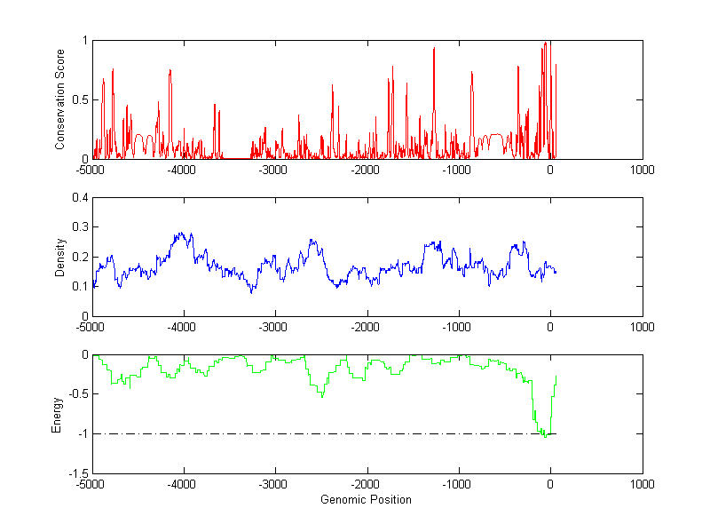 About the profiles: The conservation profile (red curve) is about conservation scores of the promoter sequences. Conservation was determined from an eight-way alignment of human, chimpanzee, dog, mouse, rat, chicken, zebrafish and fugu sequences. The conservation was quantified by a conservation score between 0 and 1, with 1 as highest conservation. The conservation score was obtained from UCSC genome databases. The density profile (blue curve) is about density of all TF binding sites. The energy profile (green curve) is about energy for module detection based on TF interaction. The positions with energy less than -1 indicate the existence of CRMs. Download: Conservation profileDensity profile Energy profile CRM summary |
