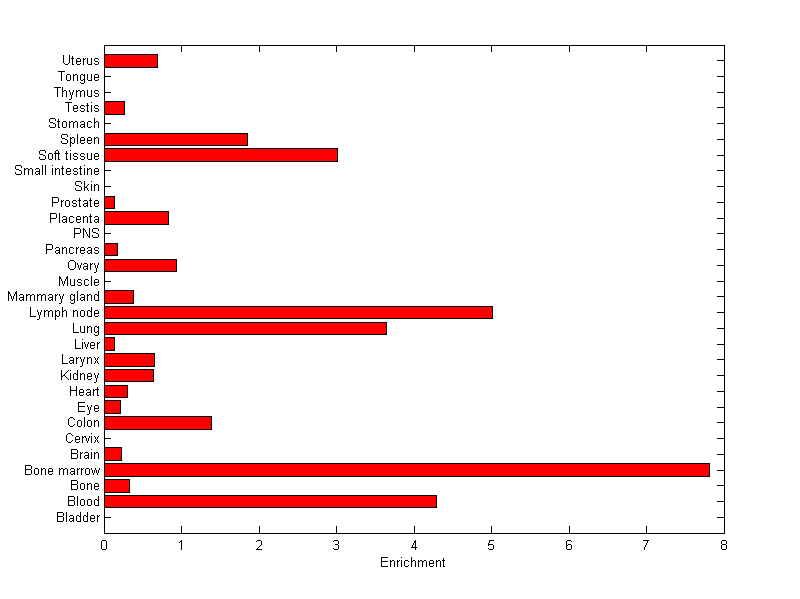 About the profile: The expression level is normalized with tissue-library size. Each value for a gene in a tissue is a ratio of observed ESTs to the expected one in this tissue. The expected number of ESTs is the product of total ESTs of the gene and the fraction of total ESTs in the tissue among all ESTs in 30 tissues. Summary: This gene is preferentially expressed in [bone_marrow, lymph_node] Download: |
