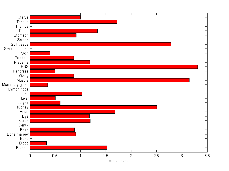 The expression level is normalized with tissue-library size. Each value for a gene in a tissue is a ratio of observed ESTs to the expected one in this tissue. The expected number of ESTs is the product of total ESTs of the gene and the fraction of total ESTs in the tissue among all ESTs in 30 tissues.