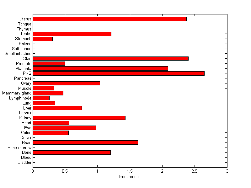 The expression level is normalized with tissue-library size. Each value for a gene in a tissue is a ratio of observed ESTs to the expected one in this tissue. The expected number of ESTs is the product of total ESTs of the gene and the fraction of total ESTs in the tissue among all ESTs in 30 tissues.