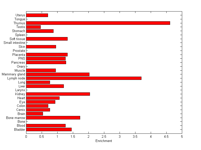 The expression level is normalized with tissue-library size. Each value for a gene in a tissue is a ratio of observed ESTs to the expected one in this tissue. The expected number of ESTs is the product of total ESTs of the gene and the fraction of total ESTs in the tissue among all ESTs in 30 tissues.