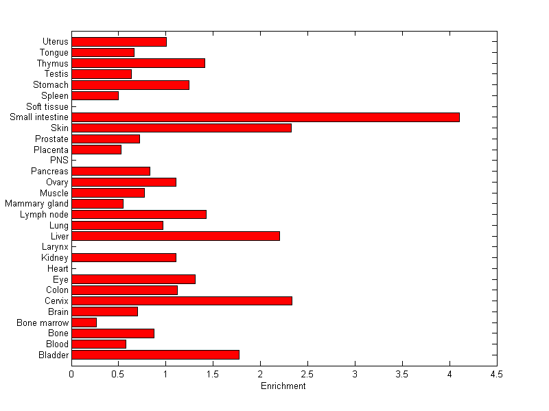 The expression level is normalized with tissue-library size. Each value for a gene in a tissue is a ratio of observed ESTs to the expected one in this tissue. The expected number of ESTs is the product of total ESTs of the gene and the fraction of total ESTs in the tissue among all ESTs in 30 tissues.