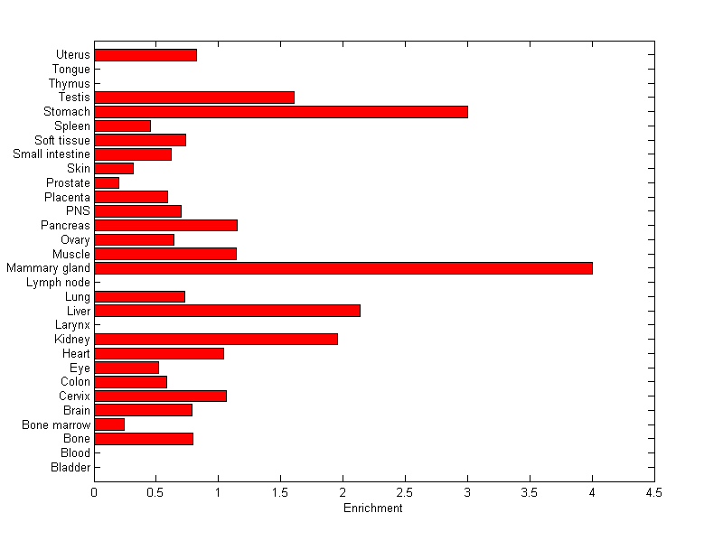 The expression level is normalized with tissue-library size. Each value for a gene in a tissue is a ratio of observed ESTs to the expected one in this tissue. The expected number of ESTs is the product of total ESTs of the gene and the fraction of total ESTs in the tissue among all ESTs in 30 tissues.