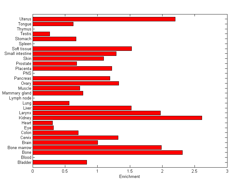 The expression level is normalized with tissue-library size. Each value for a gene in a tissue is a ratio of observed ESTs to the expected one in this tissue. The expected number of ESTs is the product of total ESTs of the gene and the fraction of total ESTs in the tissue among all ESTs in 30 tissues.