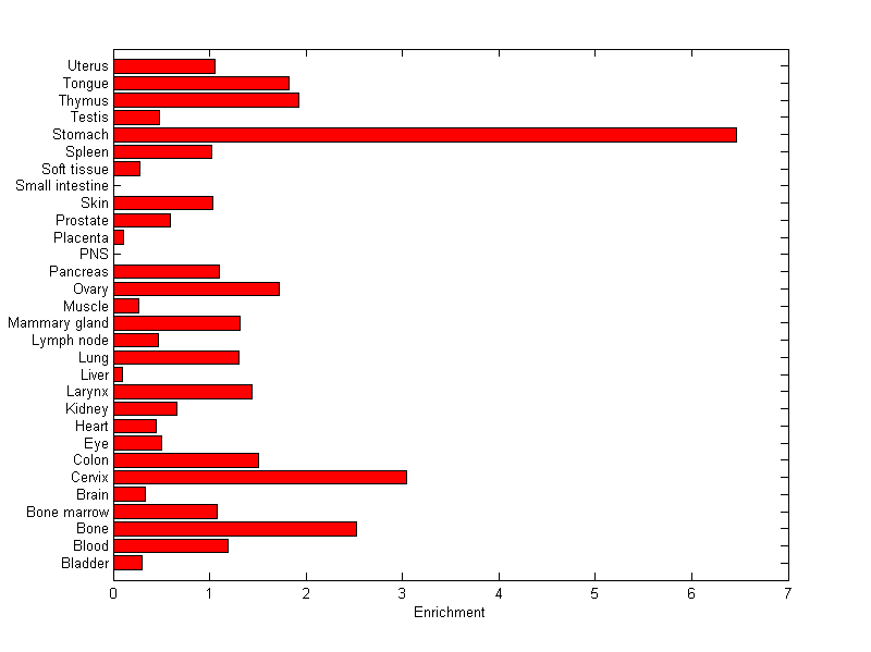 The expression level is normalized with tissue-library size. Each value for a gene in a tissue is a ratio of observed ESTs to the expected one in this tissue. The expected number of ESTs is the product of total ESTs of the gene and the fraction of total ESTs in the tissue among all ESTs in 30 tissues.