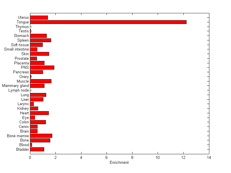The expression level is normalized with tissue-library size. Each value for a gene in a tissue is a ratio of observed ESTs to the expected one in this tissue. The expected number of ESTs is the product of total ESTs of the gene and the fraction of total ESTs in the tissue among all ESTs in 30 tissues.