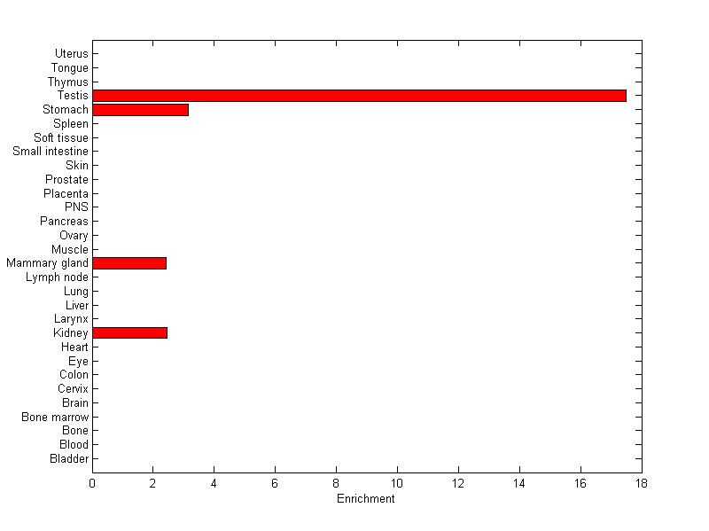 The expression level is normalized with tissue-library size. Each value for a gene in a tissue is a ratio of observed ESTs to the expected one in this tissue. The expected number of ESTs is the product of total ESTs of the gene and the fraction of total ESTs in the tissue among all ESTs in 30 tissues.