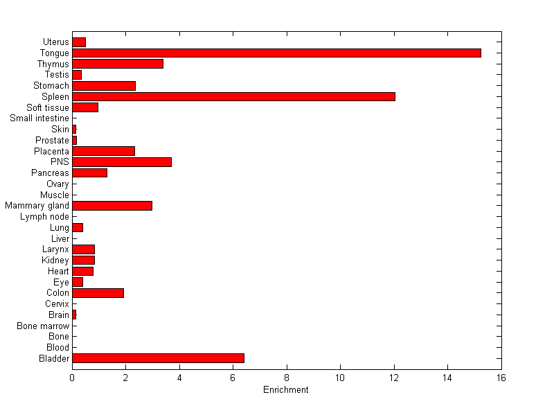 About the profile: The expression level is normalized with tissue-library size. Each value for a gene in a tissue is a ratio of observed ESTs to the expected one in this tissue. The expected number of ESTs is the product of total ESTs of the gene and the fraction of total ESTs in the tissue among all ESTs in 30 tissues. Summary: This gene is preferentially expressed in [spleen, tongue] Download: |