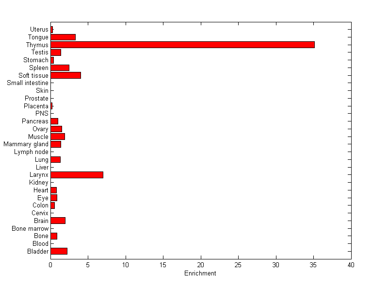 The expression level is normalized with tissue-library size. Each value for a gene in a tissue is a ratio of observed ESTs to the expected one in this tissue. The expected number of ESTs is the product of total ESTs of the gene and the fraction of total ESTs in the tissue among all ESTs in 30 tissues.