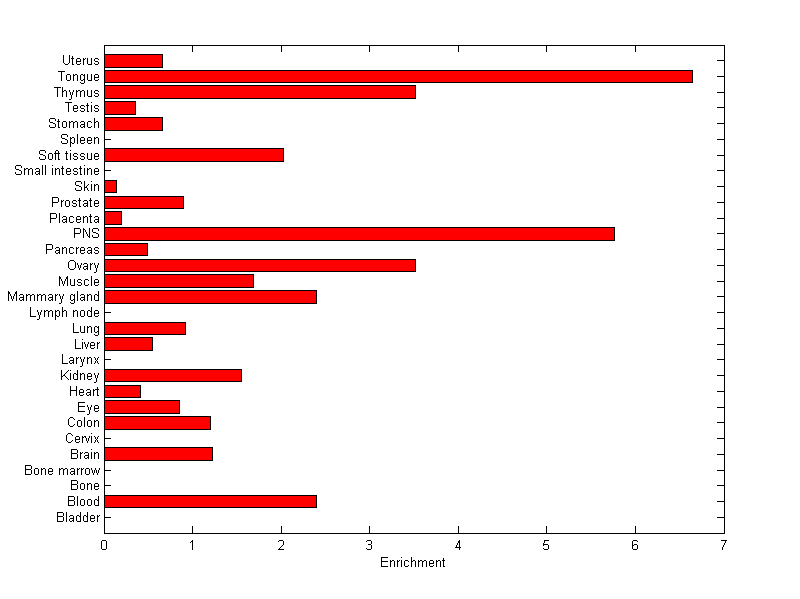 The expression level is normalized with tissue-library size. Each value for a gene in a tissue is a ratio of observed ESTs to the expected one in this tissue. The expected number of ESTs is the product of total ESTs of the gene and the fraction of total ESTs in the tissue among all ESTs in 30 tissues.