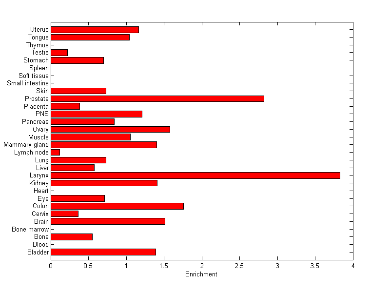 The expression level is normalized with tissue-library size. Each value for a gene in a tissue is a ratio of observed ESTs to the expected one in this tissue. The expected number of ESTs is the product of total ESTs of the gene and the fraction of total ESTs in the tissue among all ESTs in 30 tissues.