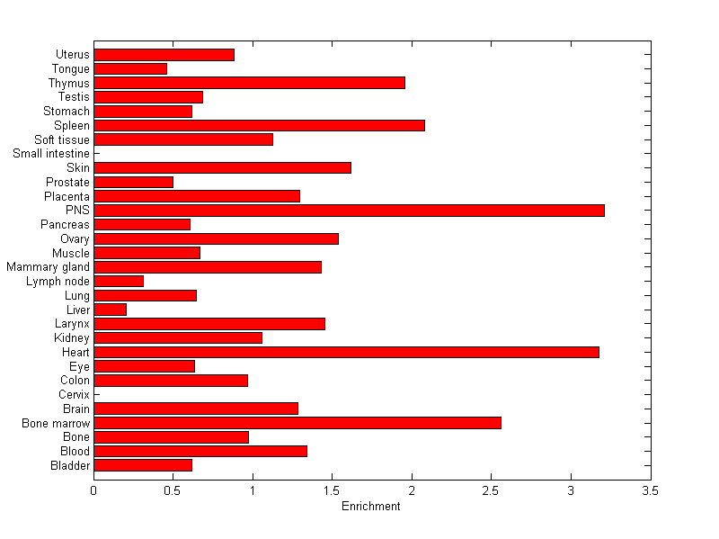 The expression level is normalized with tissue-library size. Each value for a gene in a tissue is a ratio of observed ESTs to the expected one in this tissue. The expected number of ESTs is the product of total ESTs of the gene and the fraction of total ESTs in the tissue among all ESTs in 30 tissues.