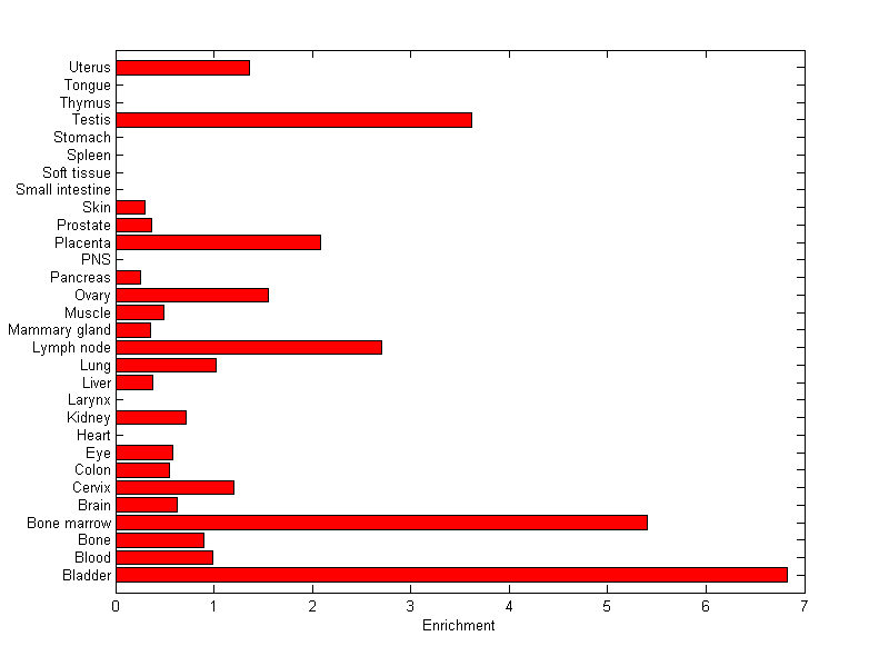 The expression level is normalized with tissue-library size. Each value for a gene in a tissue is a ratio of observed ESTs to the expected one in this tissue. The expected number of ESTs is the product of total ESTs of the gene and the fraction of total ESTs in the tissue among all ESTs in 30 tissues.