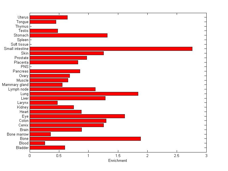 The expression level is normalized with tissue-library size. Each value for a gene in a tissue is a ratio of observed ESTs to the expected one in this tissue. The expected number of ESTs is the product of total ESTs of the gene and the fraction of total ESTs in the tissue among all ESTs in 30 tissues.