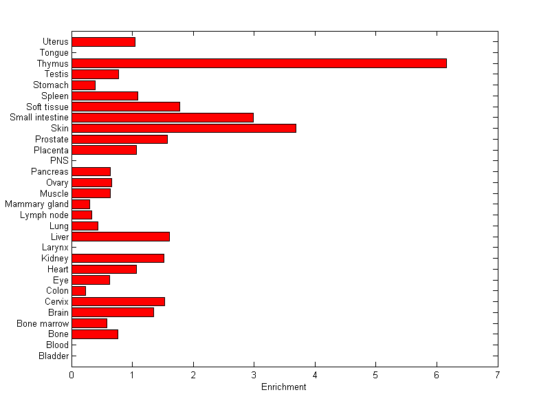 The expression level is normalized with tissue-library size. Each value for a gene in a tissue is a ratio of observed ESTs to the expected one in this tissue. The expected number of ESTs is the product of total ESTs of the gene and the fraction of total ESTs in the tissue among all ESTs in 30 tissues.