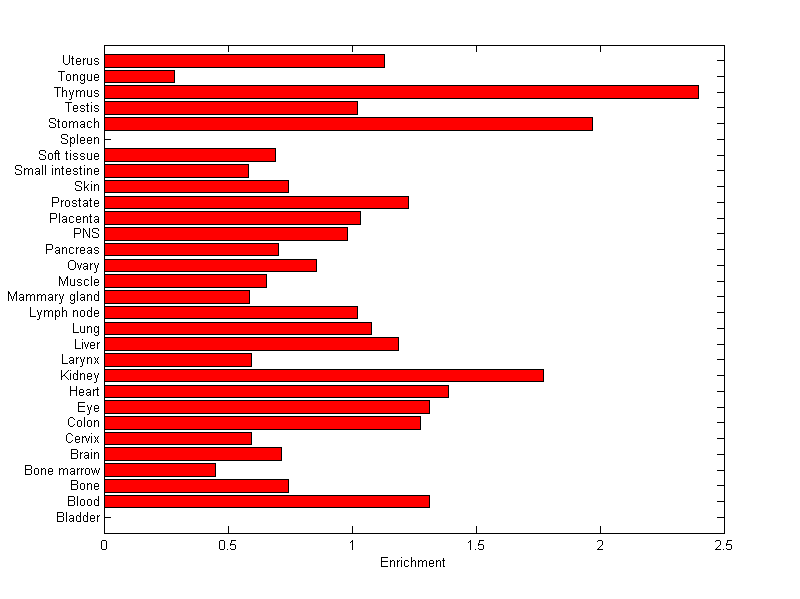 The expression level is normalized with tissue-library size. Each value for a gene in a tissue is a ratio of observed ESTs to the expected one in this tissue. The expected number of ESTs is the product of total ESTs of the gene and the fraction of total ESTs in the tissue among all ESTs in 30 tissues.
