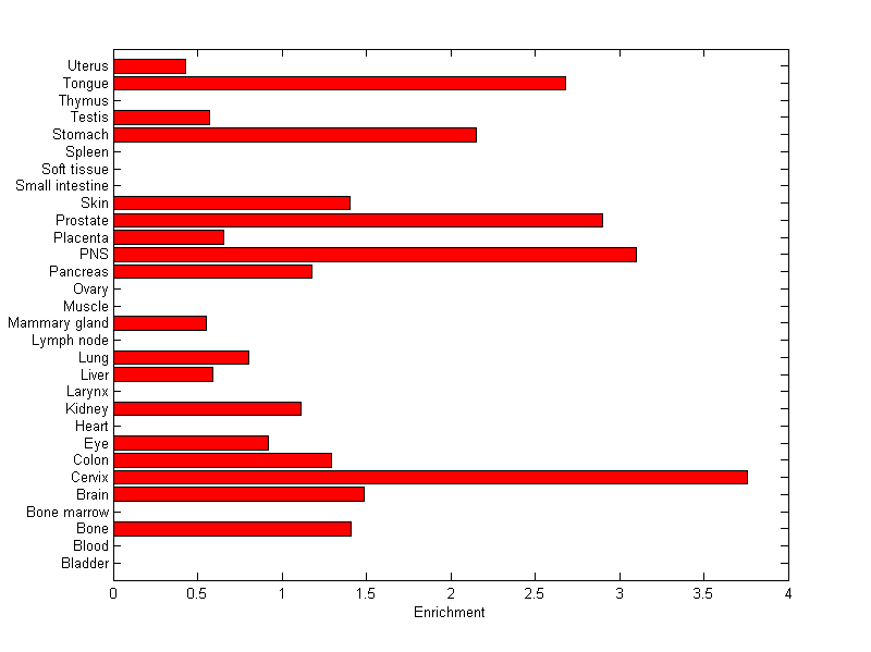 The expression level is normalized with tissue-library size. Each value for a gene in a tissue is a ratio of observed ESTs to the expected one in this tissue. The expected number of ESTs is the product of total ESTs of the gene and the fraction of total ESTs in the tissue among all ESTs in 30 tissues.