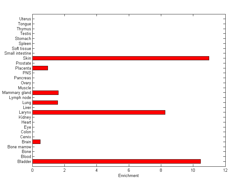 The expression level is normalized with tissue-library size. Each value for a gene in a tissue is a ratio of observed ESTs to the expected one in this tissue. The expected number of ESTs is the product of total ESTs of the gene and the fraction of total ESTs in the tissue among all ESTs in 30 tissues.