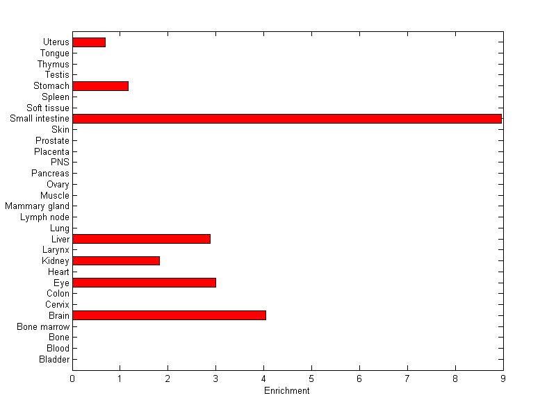 The expression level is normalized with tissue-library size. Each value for a gene in a tissue is a ratio of observed ESTs to the expected one in this tissue. The expected number of ESTs is the product of total ESTs of the gene and the fraction of total ESTs in the tissue among all ESTs in 30 tissues.
