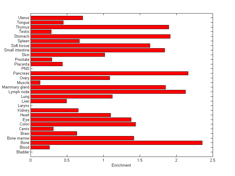 The expression level is normalized with tissue-library size. Each value for a gene in a tissue is a ratio of observed ESTs to the expected one in this tissue. The expected number of ESTs is the product of total ESTs of the gene and the fraction of total ESTs in the tissue among all ESTs in 30 tissues.