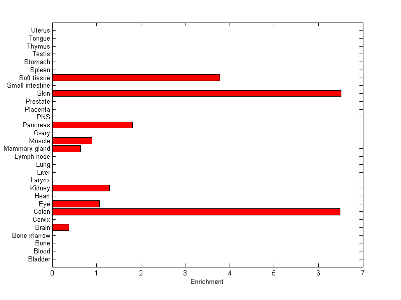 About the profile: The expression level is normalized with tissue-library size. Each value for a gene in a tissue is a ratio of observed ESTs to the expected one in this tissue. The expected number of ESTs is the product of total ESTs of the gene and the fraction of total ESTs in the tissue among all ESTs in 30 tissues. Summary: This gene is preferentially expressed in [colon, skin] Download: |