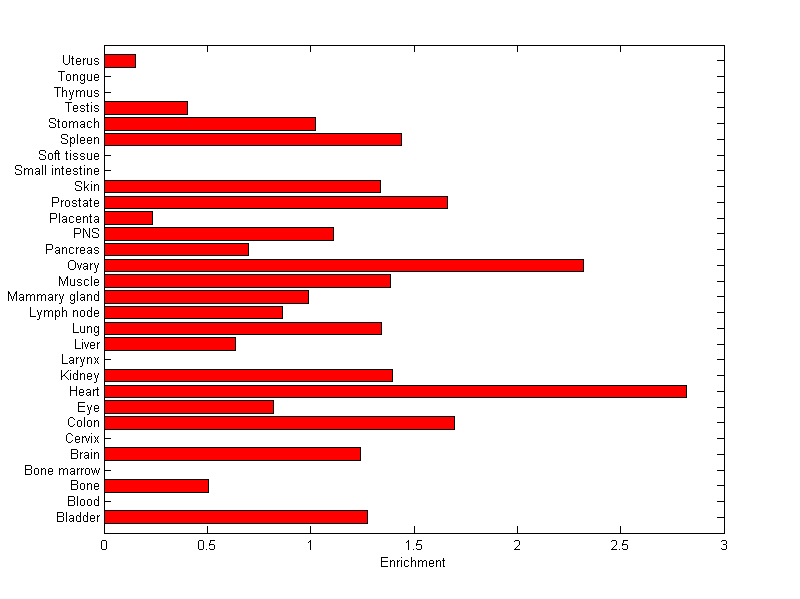 The expression level is normalized with tissue-library size. Each value for a gene in a tissue is a ratio of observed ESTs to the expected one in this tissue. The expected number of ESTs is the product of total ESTs of the gene and the fraction of total ESTs in the tissue among all ESTs in 30 tissues.