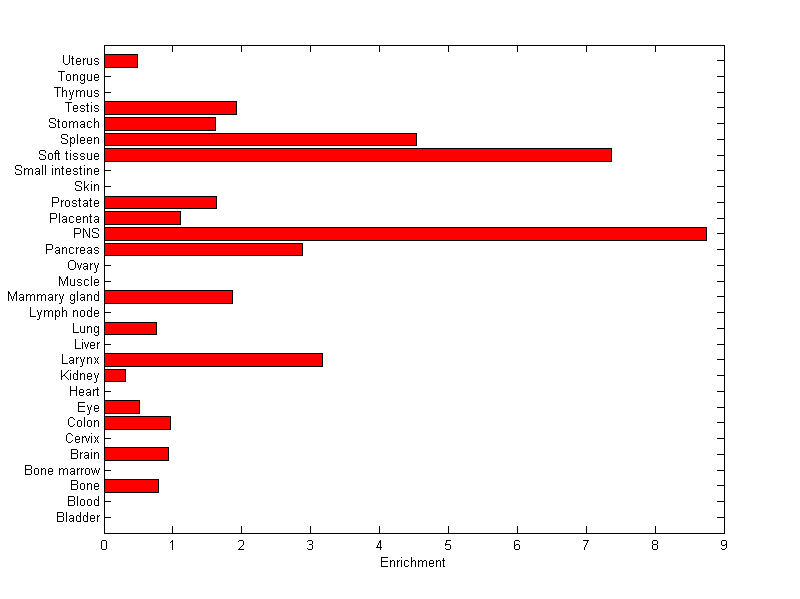 The expression level is normalized with tissue-library size. Each value for a gene in a tissue is a ratio of observed ESTs to the expected one in this tissue. The expected number of ESTs is the product of total ESTs of the gene and the fraction of total ESTs in the tissue among all ESTs in 30 tissues.