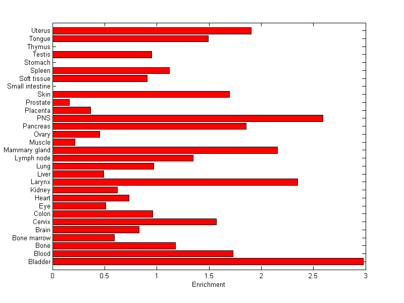 The expression level is normalized with tissue-library size. Each value for a gene in a tissue is a ratio of observed ESTs to the expected one in this tissue. The expected number of ESTs is the product of total ESTs of the gene and the fraction of total ESTs in the tissue among all ESTs in 30 tissues.