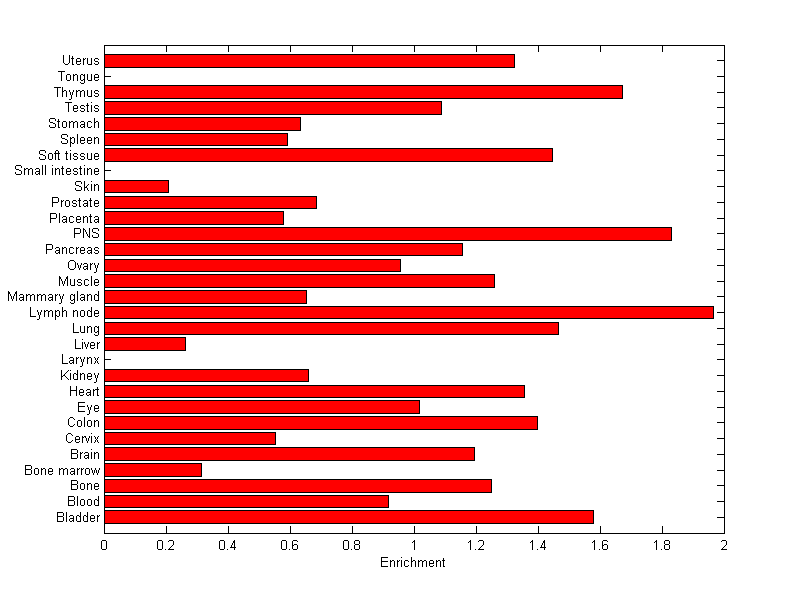 The expression level is normalized with tissue-library size. Each value for a gene in a tissue is a ratio of observed ESTs to the expected one in this tissue. The expected number of ESTs is the product of total ESTs of the gene and the fraction of total ESTs in the tissue among all ESTs in 30 tissues.