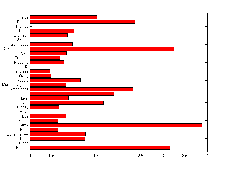 The expression level is normalized with tissue-library size. Each value for a gene in a tissue is a ratio of observed ESTs to the expected one in this tissue. The expected number of ESTs is the product of total ESTs of the gene and the fraction of total ESTs in the tissue among all ESTs in 30 tissues.