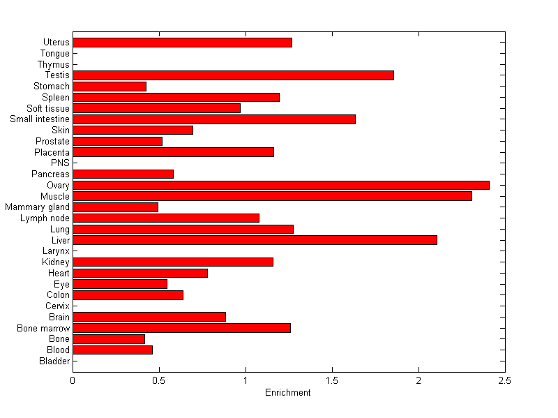 The expression level is normalized with tissue-library size. Each value for a gene in a tissue is a ratio of observed ESTs to the expected one in this tissue. The expected number of ESTs is the product of total ESTs of the gene and the fraction of total ESTs in the tissue among all ESTs in 30 tissues.