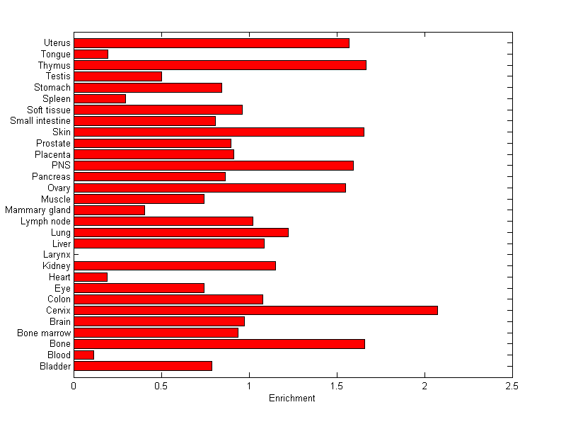 The expression level is normalized with tissue-library size. Each value for a gene in a tissue is a ratio of observed ESTs to the expected one in this tissue. The expected number of ESTs is the product of total ESTs of the gene and the fraction of total ESTs in the tissue among all ESTs in 30 tissues.