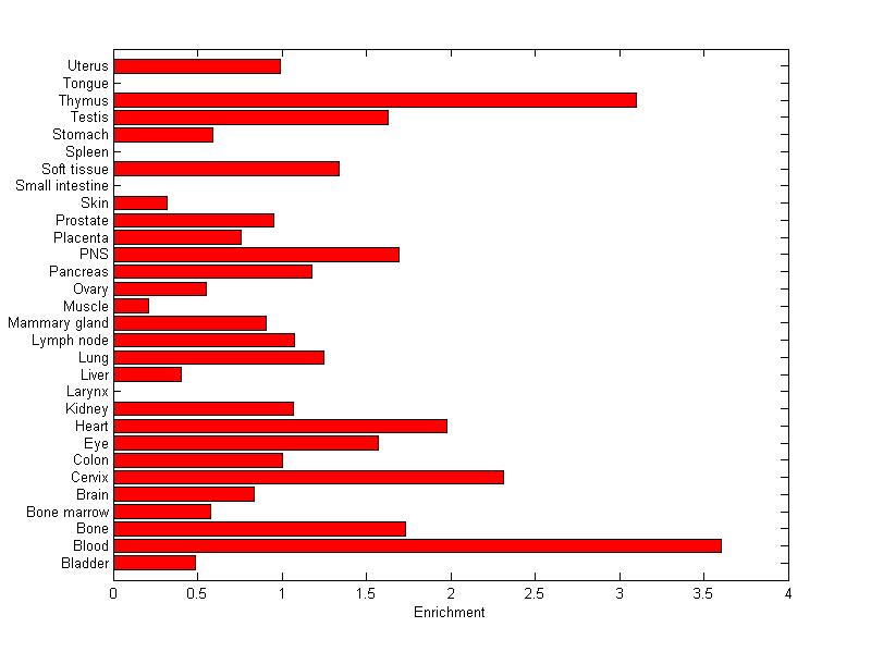 The expression level is normalized with tissue-library size. Each value for a gene in a tissue is a ratio of observed ESTs to the expected one in this tissue. The expected number of ESTs is the product of total ESTs of the gene and the fraction of total ESTs in the tissue among all ESTs in 30 tissues.