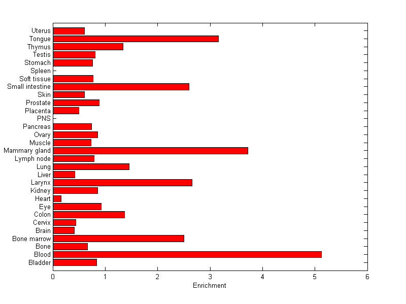 The expression level is normalized with tissue-library size. Each value for a gene in a tissue is a ratio of observed ESTs to the expected one in this tissue. The expected number of ESTs is the product of total ESTs of the gene and the fraction of total ESTs in the tissue among all ESTs in 30 tissues.