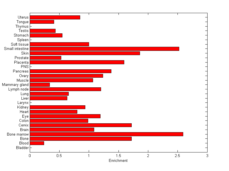 The expression level is normalized with tissue-library size. Each value for a gene in a tissue is a ratio of observed ESTs to the expected one in this tissue. The expected number of ESTs is the product of total ESTs of the gene and the fraction of total ESTs in the tissue among all ESTs in 30 tissues.