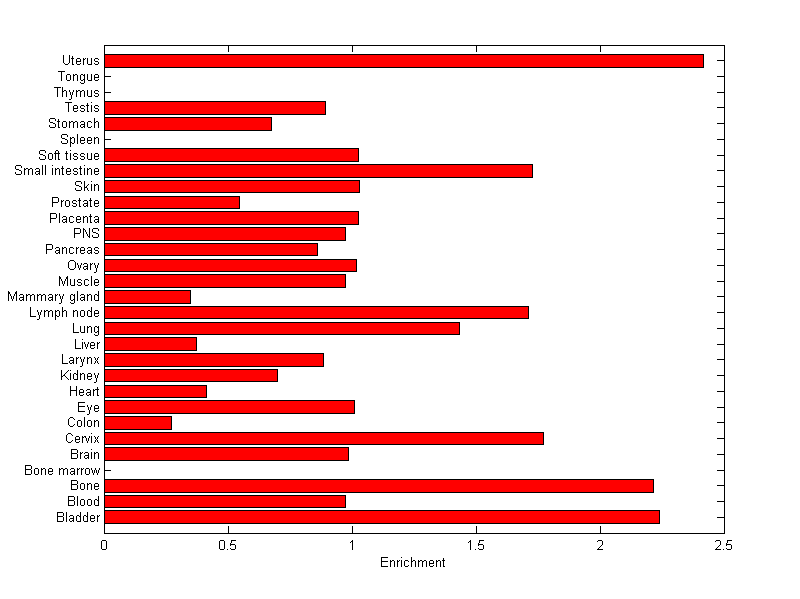 The expression level is normalized with tissue-library size. Each value for a gene in a tissue is a ratio of observed ESTs to the expected one in this tissue. The expected number of ESTs is the product of total ESTs of the gene and the fraction of total ESTs in the tissue among all ESTs in 30 tissues.