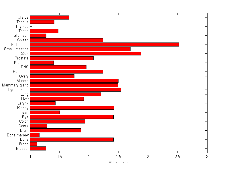 The expression level is normalized with tissue-library size. Each value for a gene in a tissue is a ratio of observed ESTs to the expected one in this tissue. The expected number of ESTs is the product of total ESTs of the gene and the fraction of total ESTs in the tissue among all ESTs in 30 tissues.