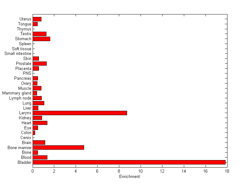 The expression level is normalized with tissue-library size. Each value for a gene in a tissue is a ratio of observed ESTs to the expected one in this tissue. The expected number of ESTs is the product of total ESTs of the gene and the fraction of total ESTs in the tissue among all ESTs in 30 tissues.