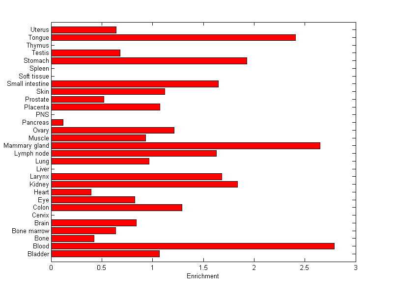 The expression level is normalized with tissue-library size. Each value for a gene in a tissue is a ratio of observed ESTs to the expected one in this tissue. The expected number of ESTs is the product of total ESTs of the gene and the fraction of total ESTs in the tissue among all ESTs in 30 tissues.
