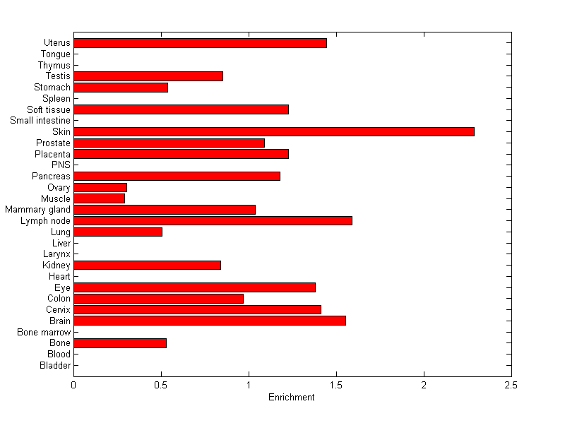 The expression level is normalized with tissue-library size. Each value for a gene in a tissue is a ratio of observed ESTs to the expected one in this tissue. The expected number of ESTs is the product of total ESTs of the gene and the fraction of total ESTs in the tissue among all ESTs in 30 tissues.