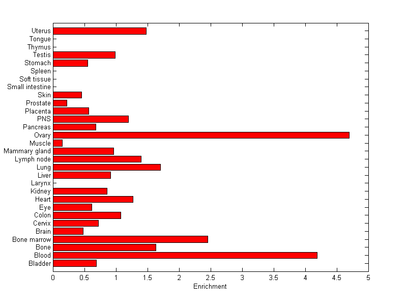 The expression level is normalized with tissue-library size. Each value for a gene in a tissue is a ratio of observed ESTs to the expected one in this tissue. The expected number of ESTs is the product of total ESTs of the gene and the fraction of total ESTs in the tissue among all ESTs in 30 tissues.